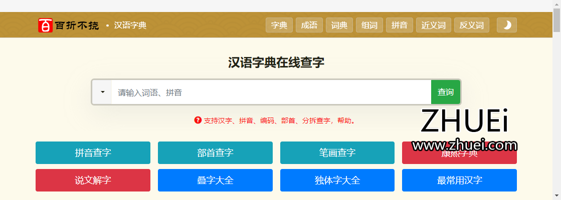 汉语字典,收录各类汉字共9万4千多个,是国内收录汉字最多、最全、最专业、功能最多的免费在线查字网站之一。覆盖了新华字典中所有汉字,还包括了9000多个汉字的书写动画和笔顺笔画规范。您可以查询相关汉字的拼音、读音、字义、解释、引证、输入法、书写动画、笔顺笔画、各类编码、康熙字典、说文解字和翻译等等。